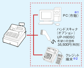 | パソコン※1やハンドスキャナ、クレジット端末※2などと接続できるRS-232ポート2基を標準装備。クレジット端末※2と連携すればスムーズなレジワークが可能になります。 |