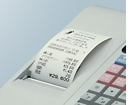 約8行/秒印字できる、感熱印字方式の58mm幅サーマルプリンタを 搭載しました。 きれいな文字の店名ロゴ入りレシートをすばやく出力します。